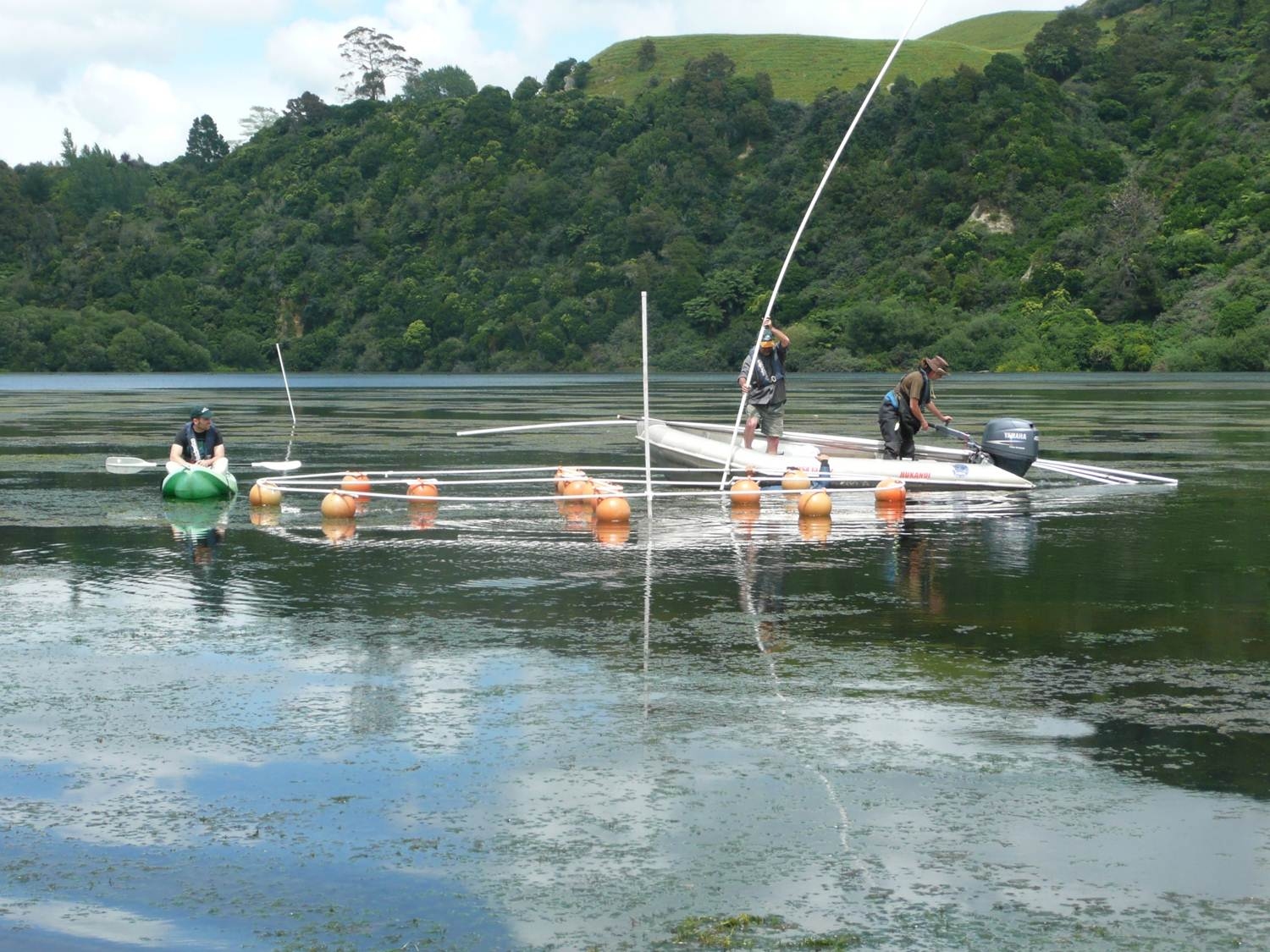 Inserting poles into the lake sediment which secure the frame in place. Credit: John Clayton