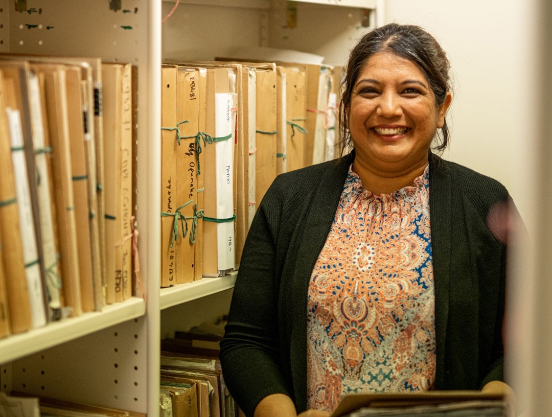 NIWA climate technician Seema Singh among the stacks and stacks of historic weather records that are being scanned and digitised before they disintegrate.