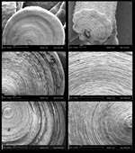 SEM images of thin sections from various bamboo coral species in the New Zealand region (Isididae: Keratoisidinae and Mopseinae) show fine growth rings.