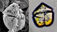 SEM (left) and light (right) micrographs - ventral views of cells showing a keel-like bulge (arrowheads), very long apical groove (AG), unusual flap of cell membrane (F), and sulcal intrusion (SI).