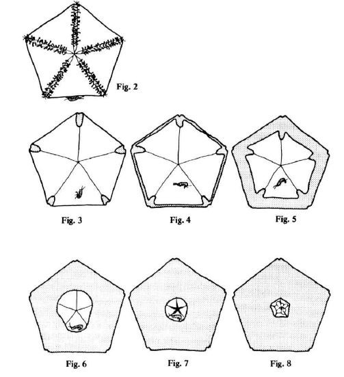 Sequence of Stegnaster inflatus trapping and eating an amphipod on the wall of an aquarium. The stippled areas of the seastar are where it is pressed firmly against the aquarium glass. Credit: Figures 2-8 from Grace, 1974.