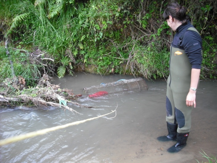 Kimberley Maxwell setting a hīnaki in her secret fishing spot. Credit: NIWA.