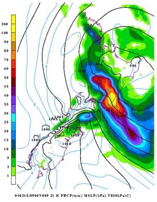 24-hour rainfall total up until 9.00 a.m. on 16 February 2004, as estimated by NIWA’s weather models.