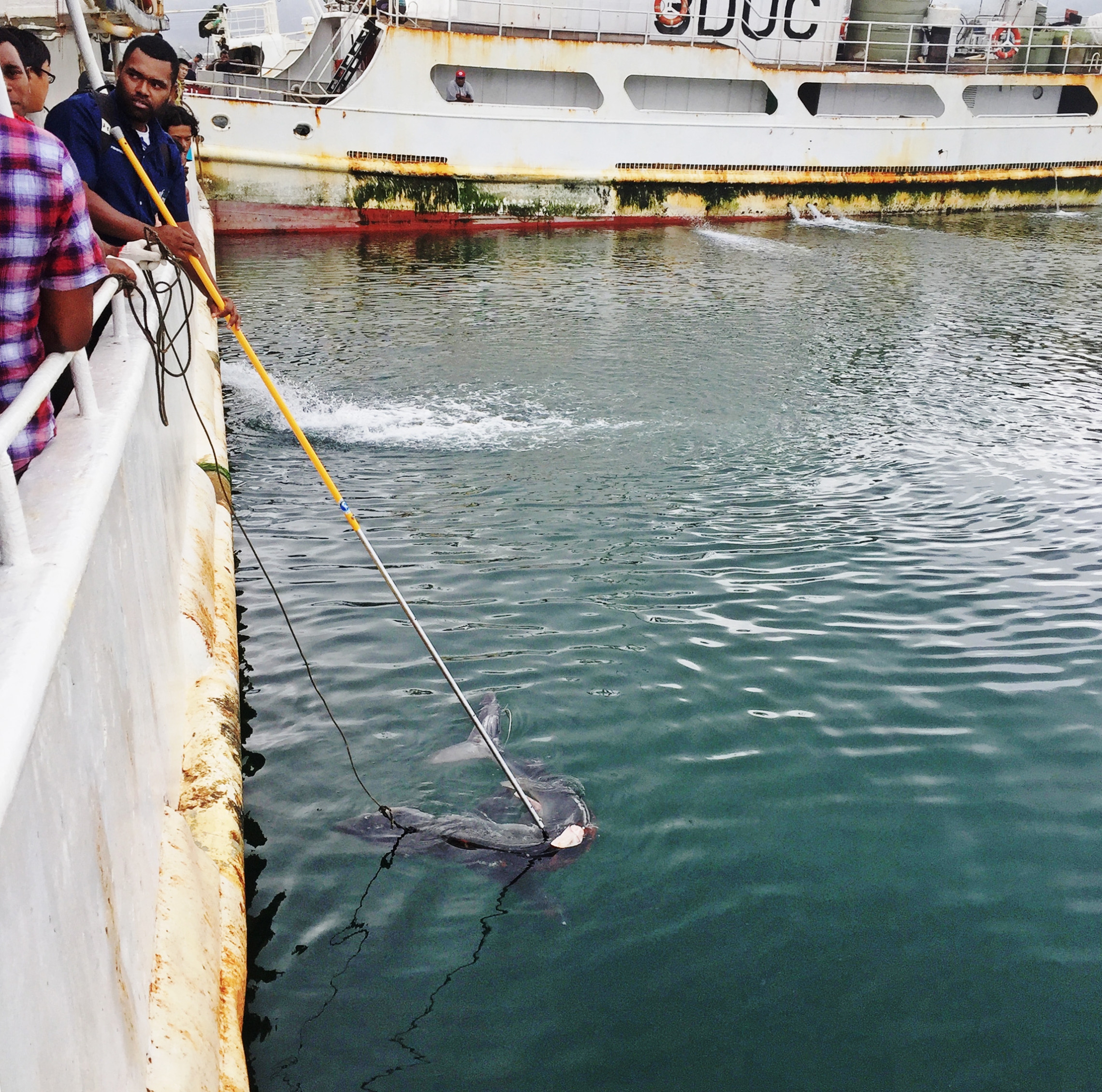 NIWA's Warrick Lyon worked with and trained fisheries observers in Fiji in 2017 to tag sharks as part of the Common Oceans Areas Beyond National Jurisdiction (ABNJ) Tuna Project.