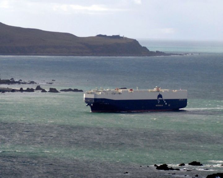 TransFuture 5 enters Wellington harbour. NIWA's atmospheric research station at Baring Head is in the background. (photo: Alan Blacklock)