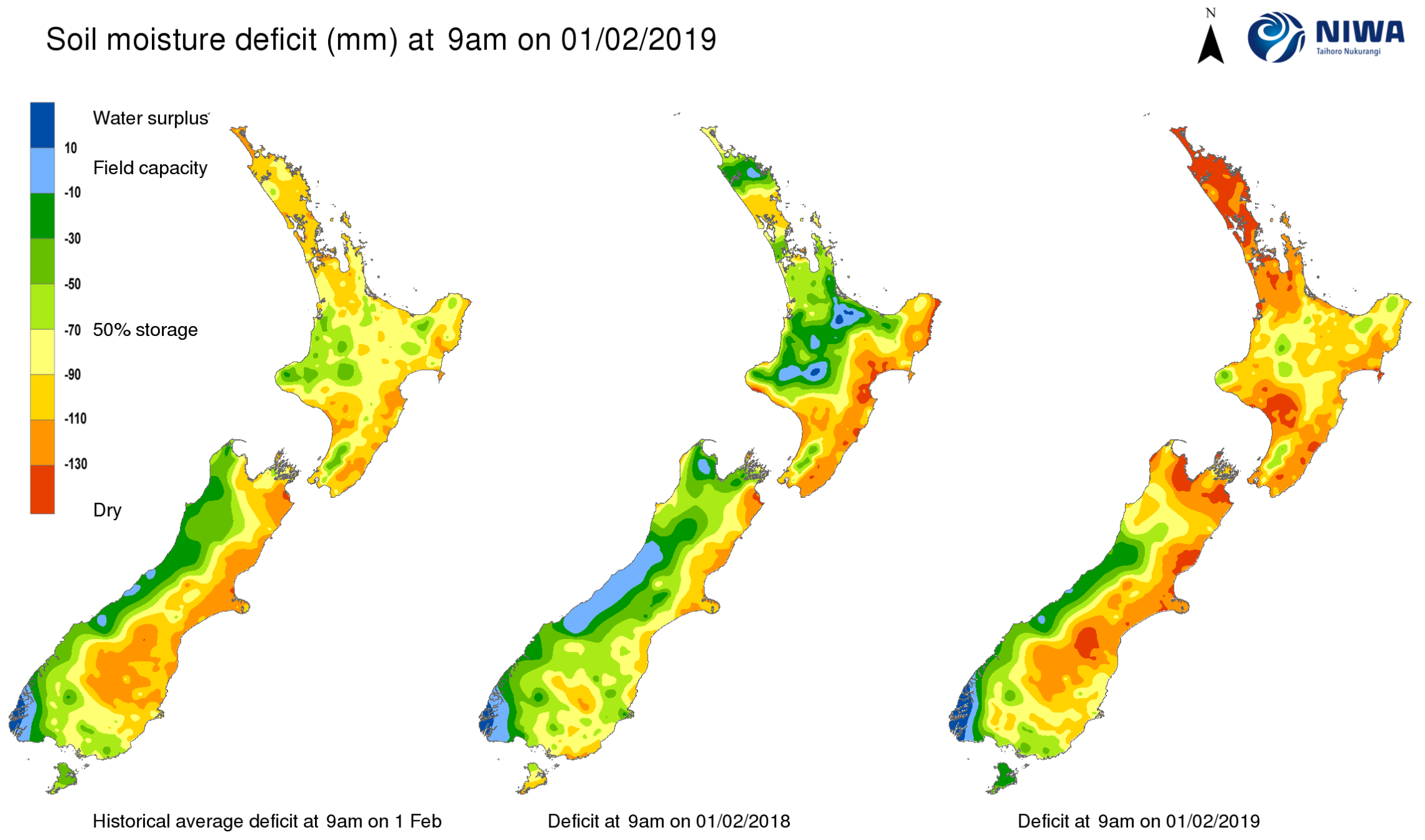 End of month water balance in the pasture root zone for an average soil type where the available water capacity is taken to be 150 mm.