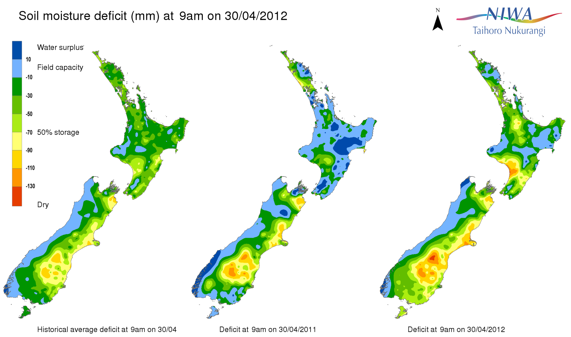 End of month water balance in the pasture root zone for an average soil type, where the available water capacity is 150mm.