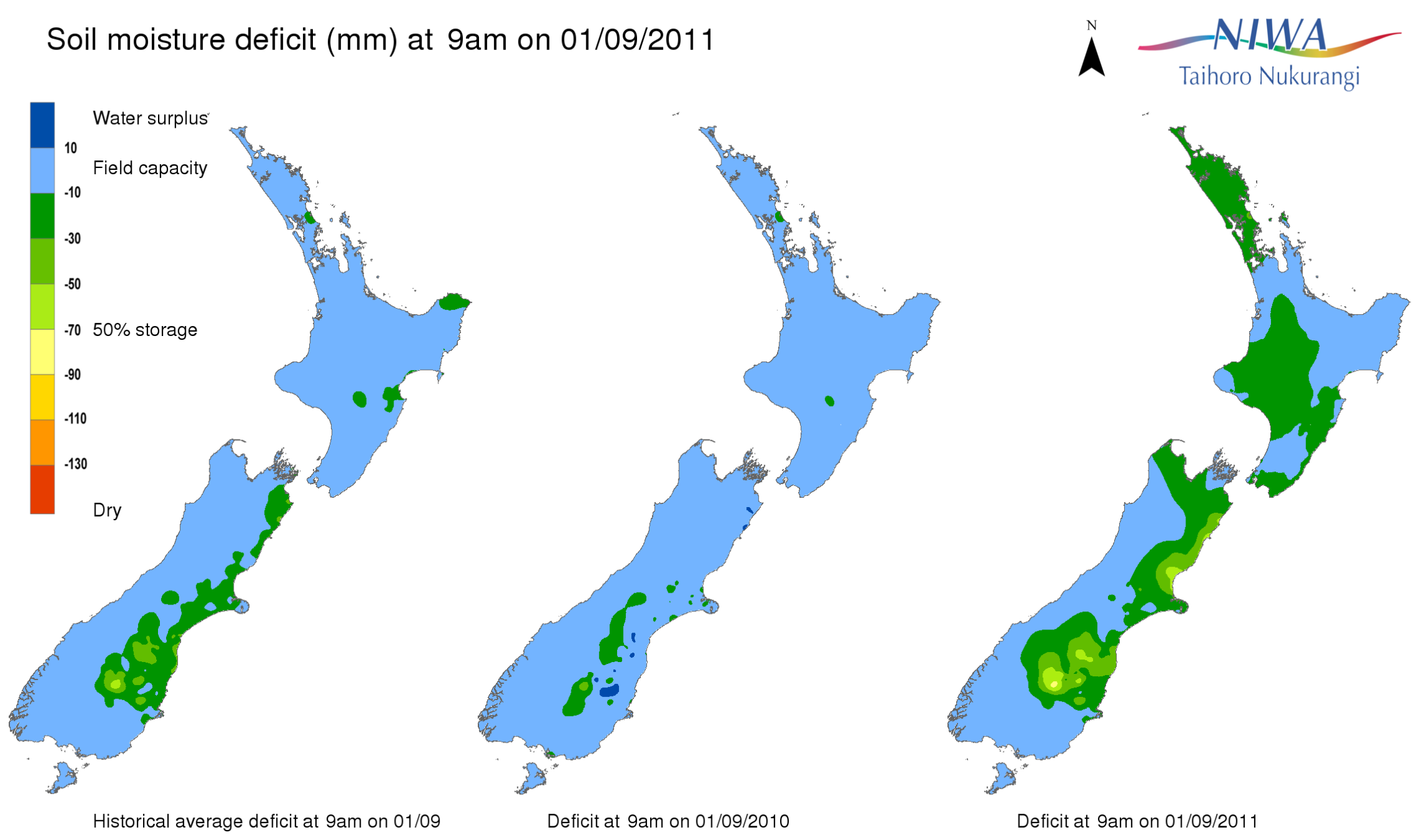 End of month water balance in the pasture root zone for an average soil type, where the available water capacity is 150mm