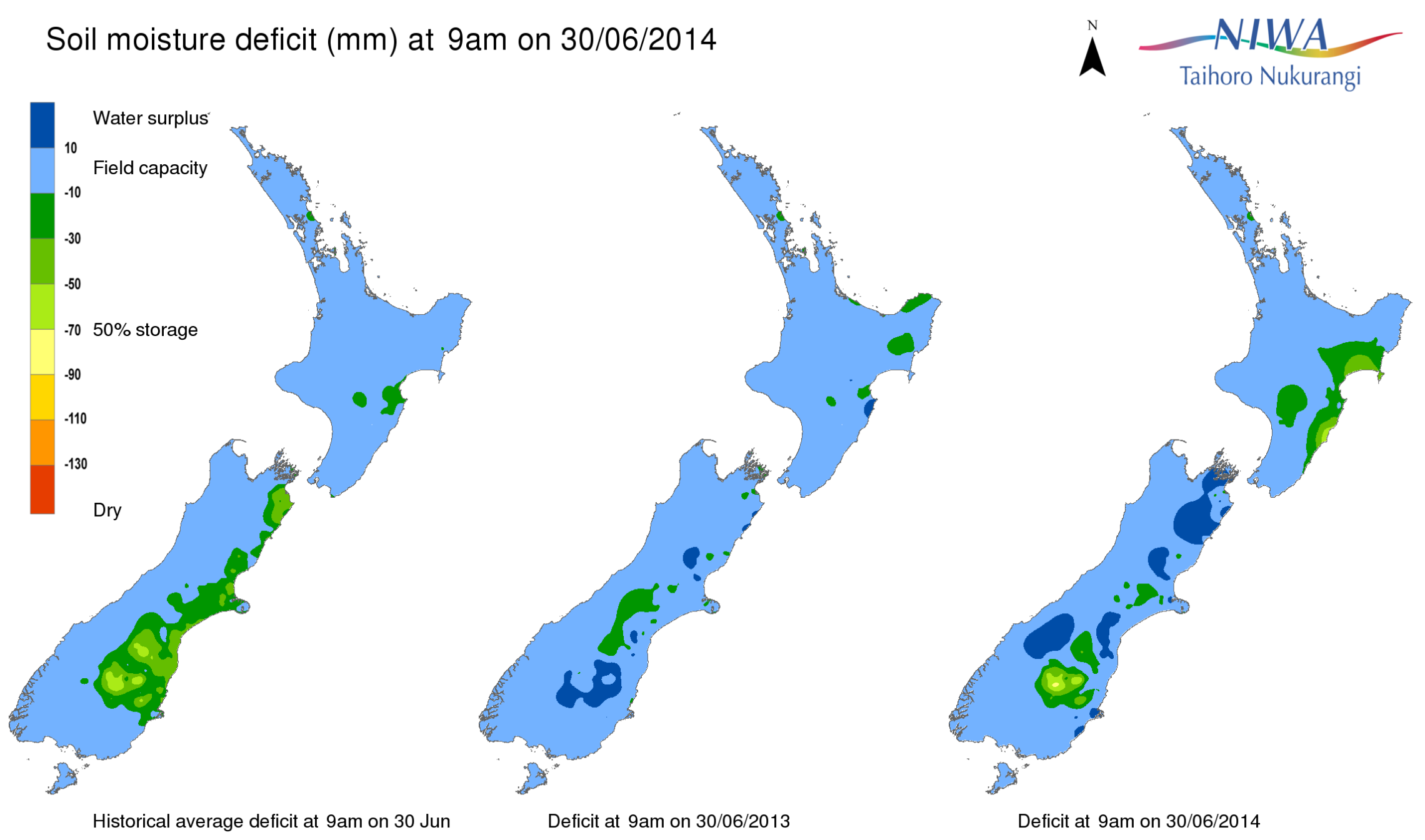 End of month water balance in the pasture root zone for an average soil type where the available water capacity is taken to be 150 mm.