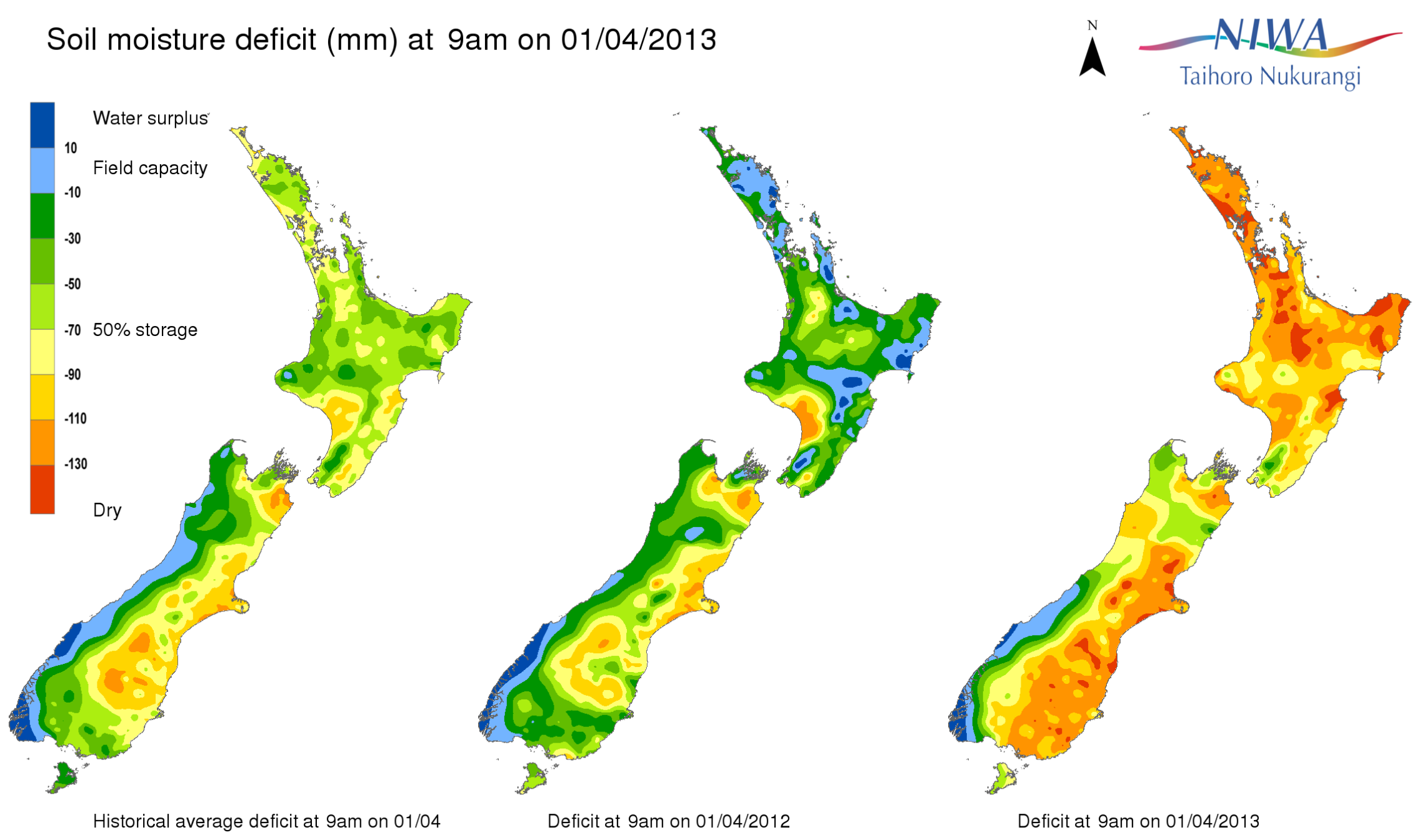 End of month water balance in the pasture root zone for an average soil type where the available water capacity is taken to be 150 mm.