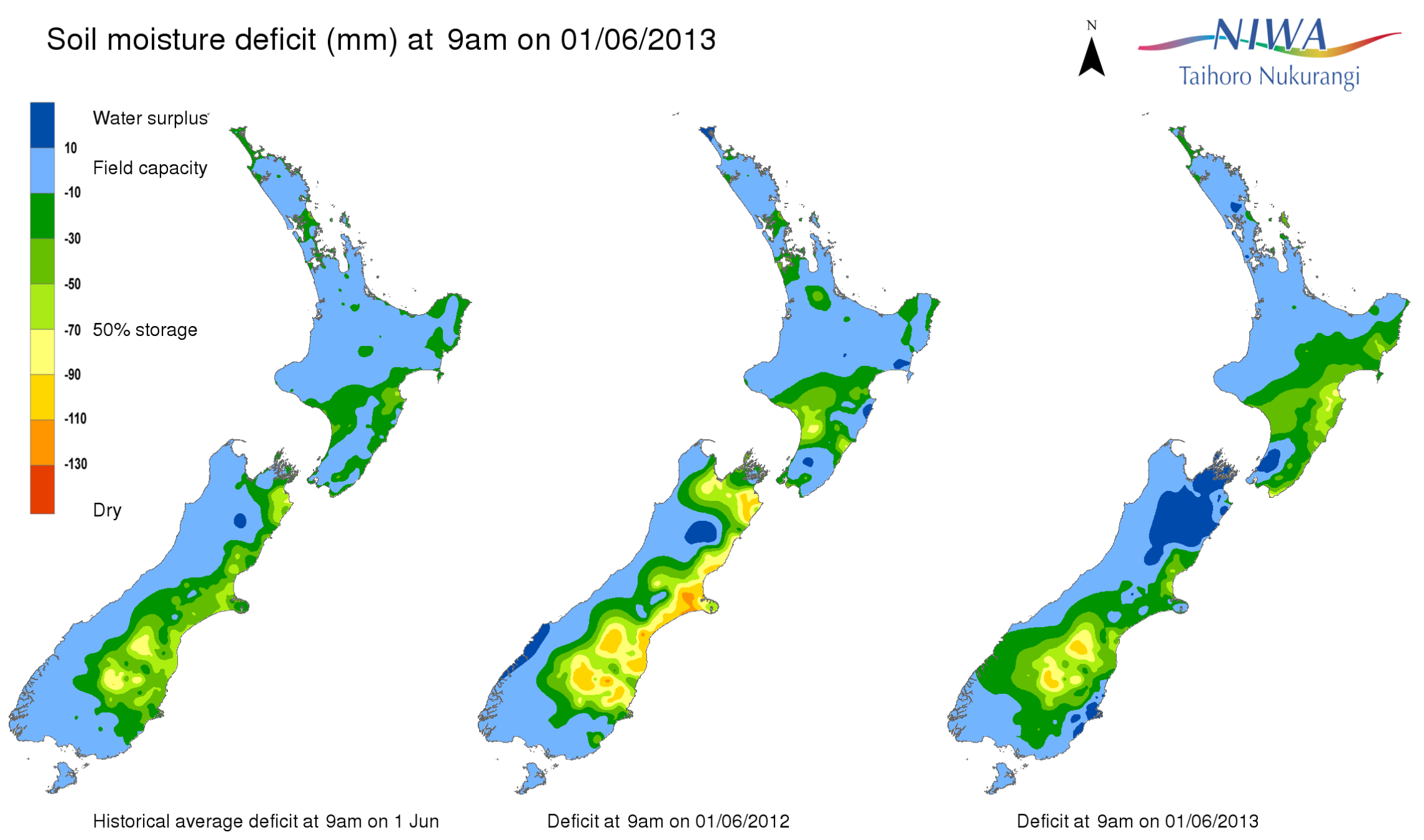 End of month water balance in the pasture root zone for an average soil type where the available water capacity is taken to be 150 mm.