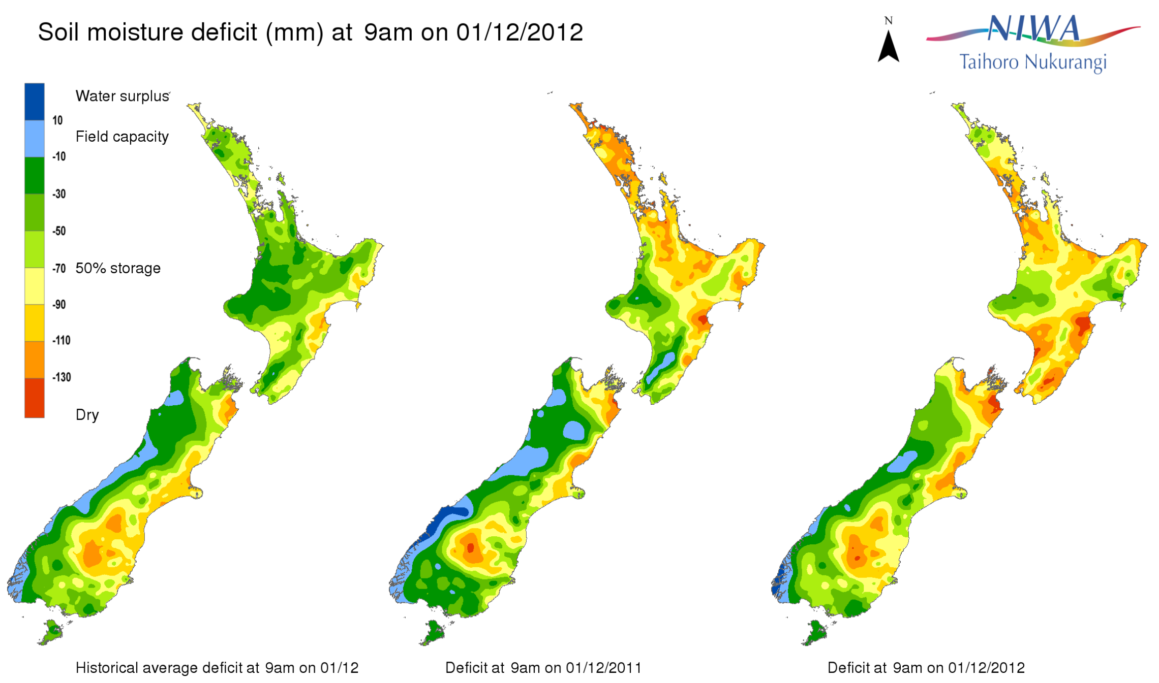 End of month water balance in the pasture root zone for an average soil type where the available water capacity is taken to be 150 mm.