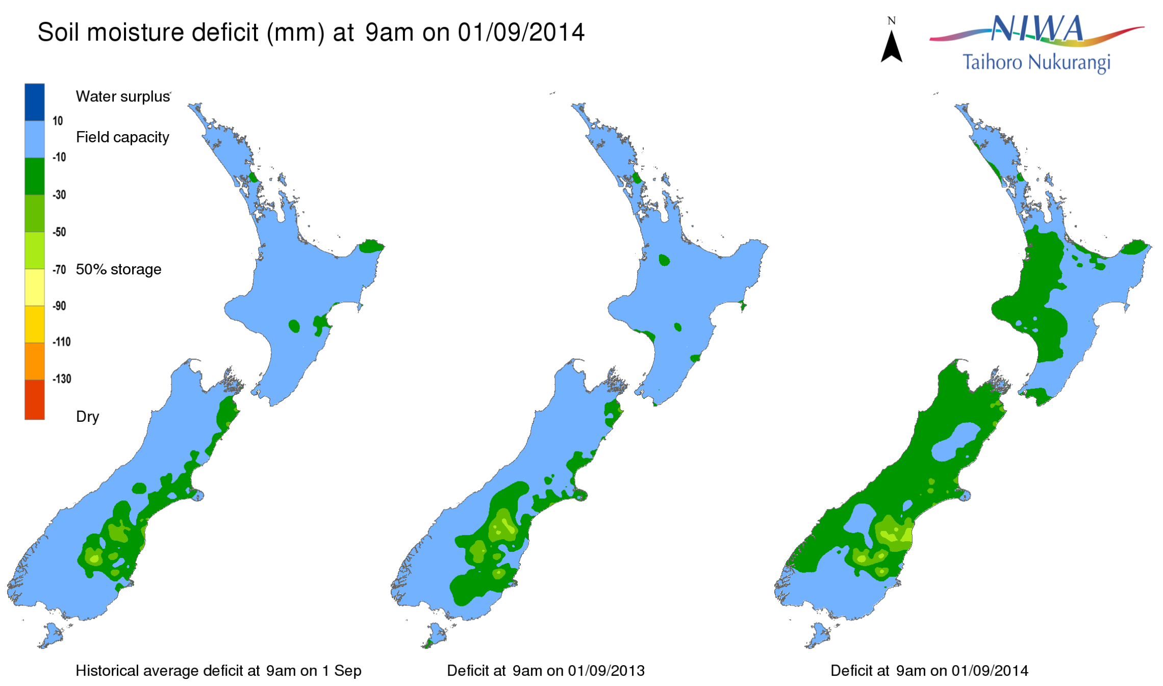 End of month water balance in the pasture root zone for an average soil type where the available water capacity is taken to be 150 mm.