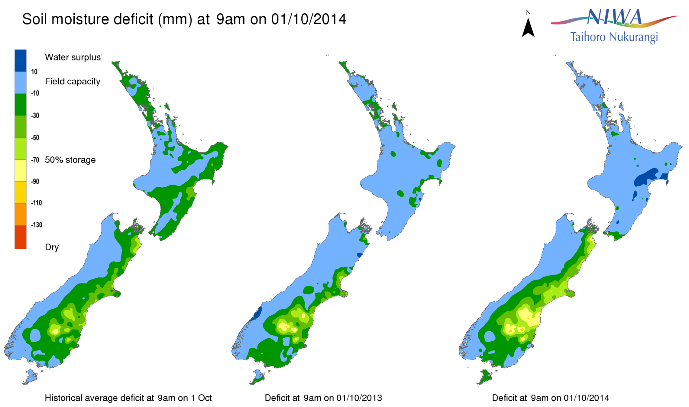 End of month water balance in the pasture root zone for an average soil type where the available water capacity is taken to be 150 mm.