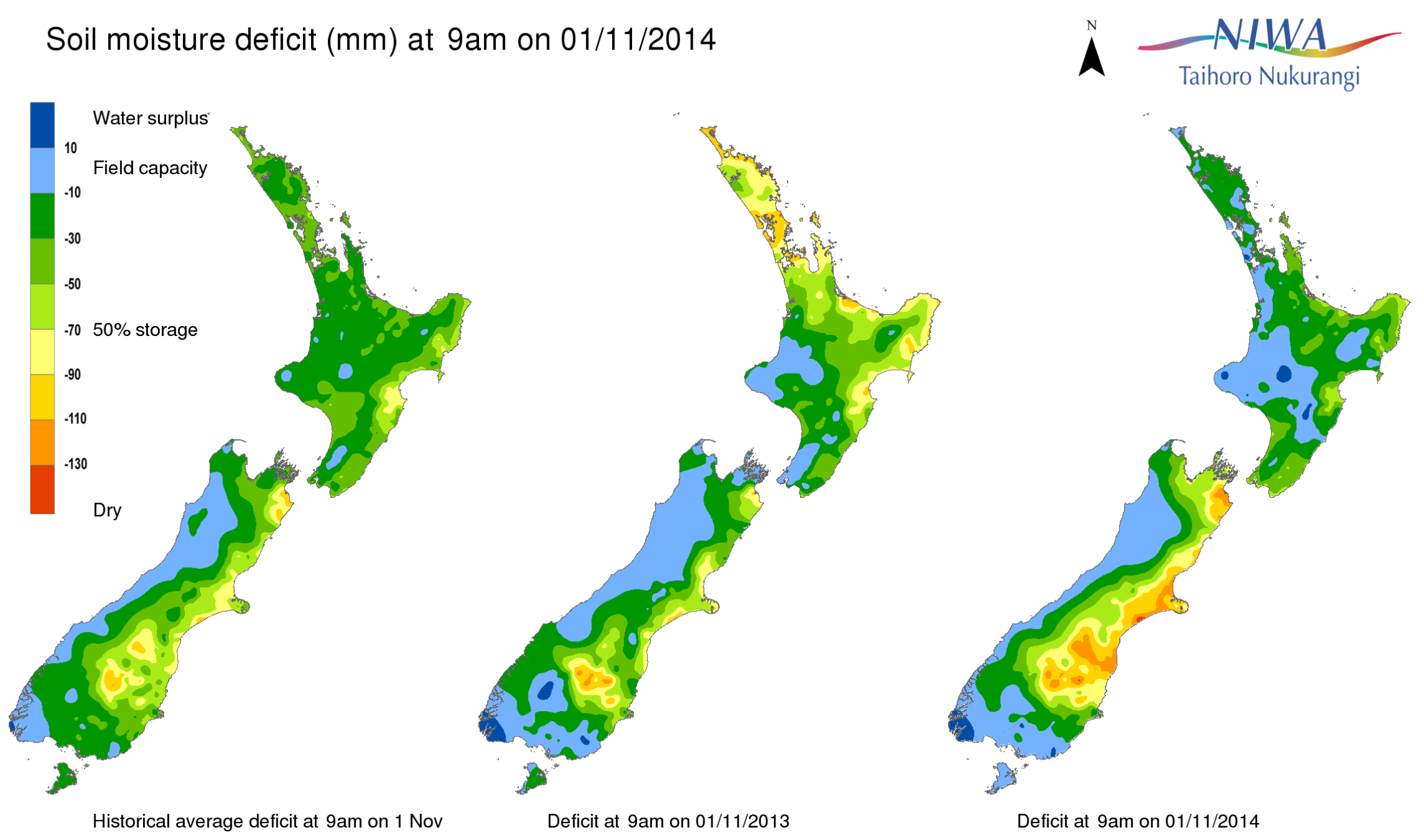 End of month water balance in the pasture root zone for an average soil type where the available water capacity is taken to be 150 mm.