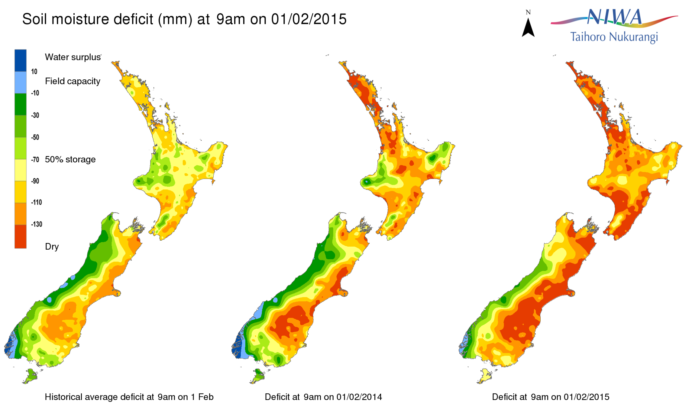 End of month water balance in the pasture root zone for an average soil type where the available water capacity is taken to be 150 mm.