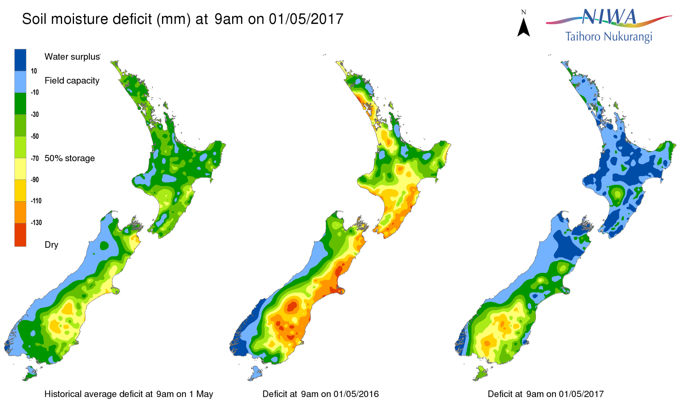 End of month water balance in the pasture root zone for an average soil type where the available water capacity is taken to be 150 mm.
