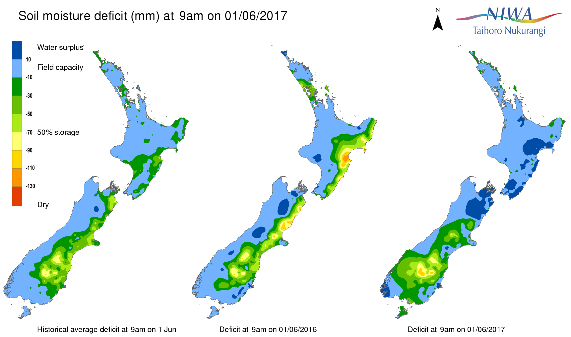 End of month water balance in the pasture root zone for an average soil type where the available water capacity is taken to be 150 mm.