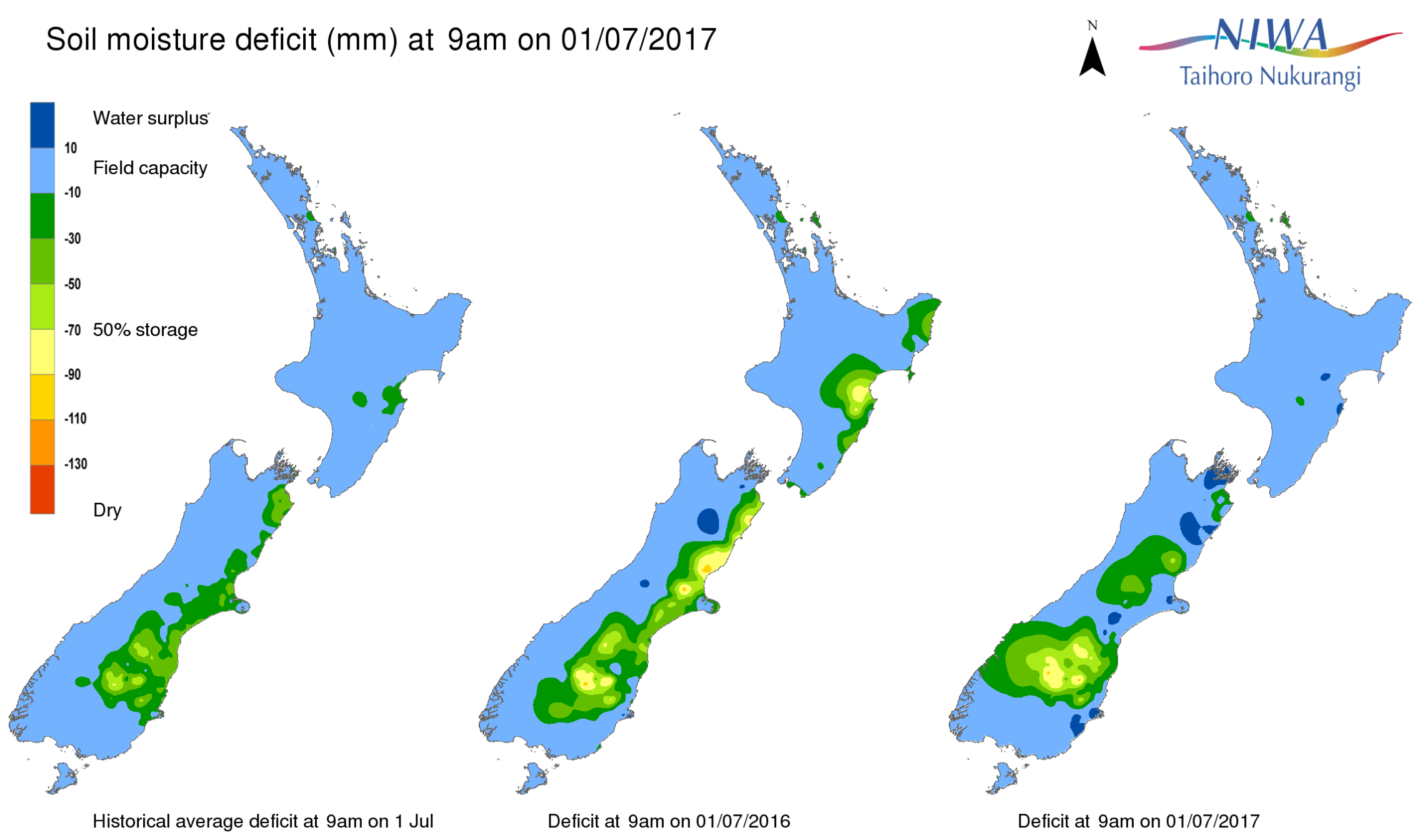 End of month water balance in the pasture root zone for an average soil type where the available water capacity is taken to be 150 mm.