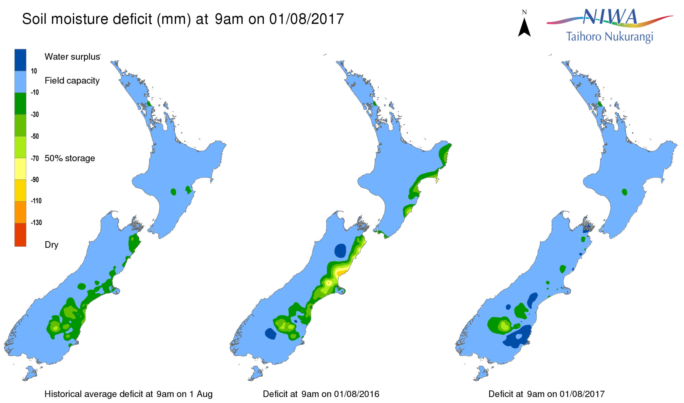 End of month water balance in the pasture root zone for an average soil type where the available water capacity is taken to be 150 mm.