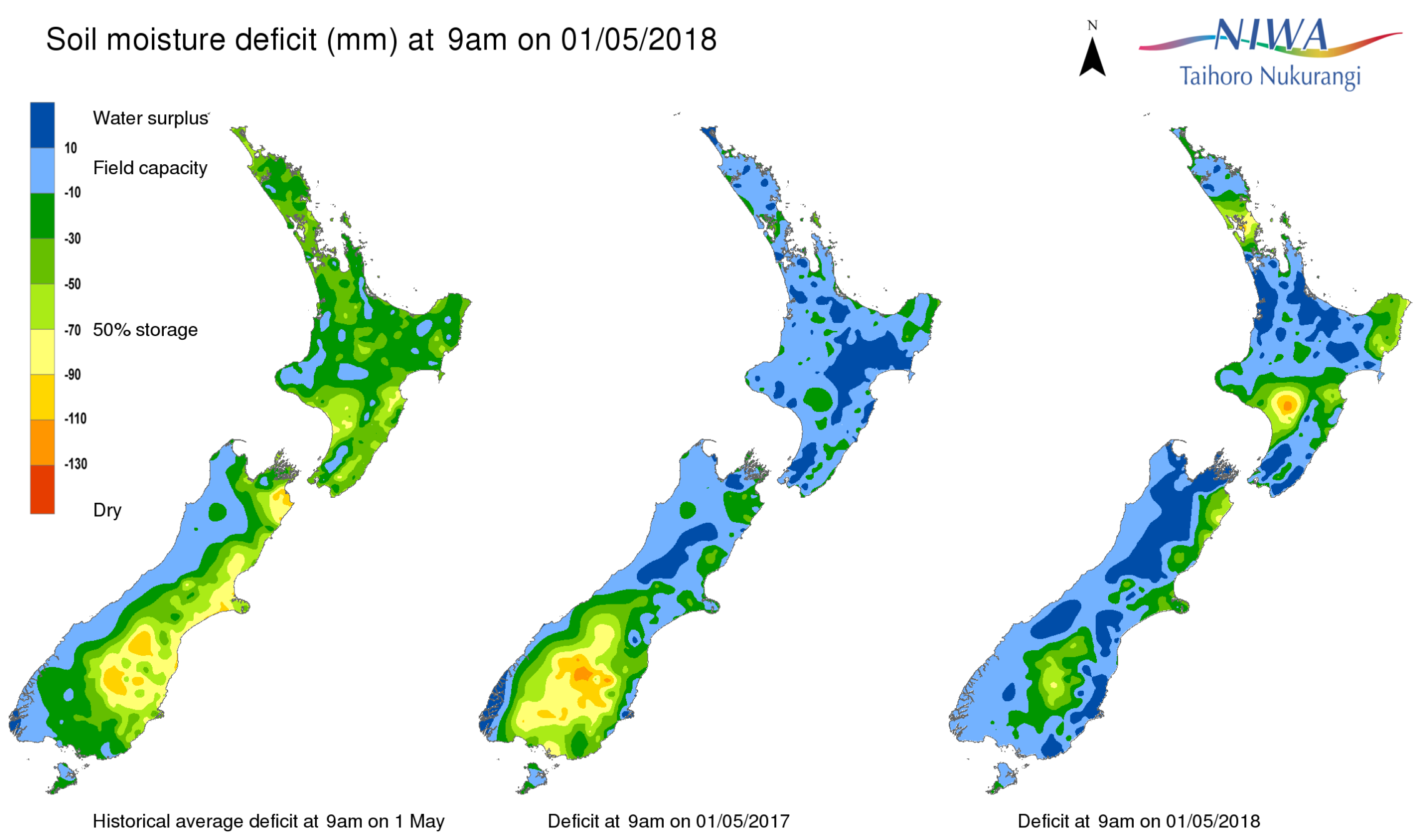 End of month water balance in the pasture root zone for an average soil type where the available water capacity is taken to be 150 mm.