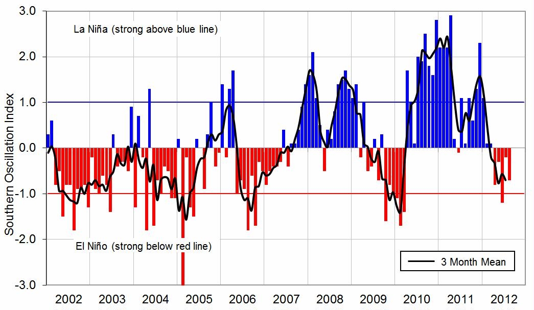 Monthly values of the Southern Oscillation Index (SOI), a measure of changes in atmospheric pressures across the Pacific, and the 3-month mean (black line). SOI mean values: August SOI -0.7; June to August average -0.7.