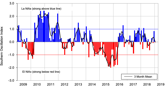 Monthly values of the Southern Oscillation Index (SOI), a measure of changes in atmospheric pressures across the Pacific, and the 3-month mean (black line). SOI mean values: Janaury SOI 0.03; November-January average 0.2.