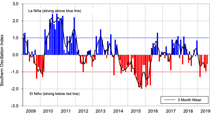 Monthly values of the Southern Oscillation Index (SOI), a measure of changes in atmospheric pressures across the Pacific, and the 3-month mean (black line). SOI mean values: July SOI -0.53; May-July average -0.8.