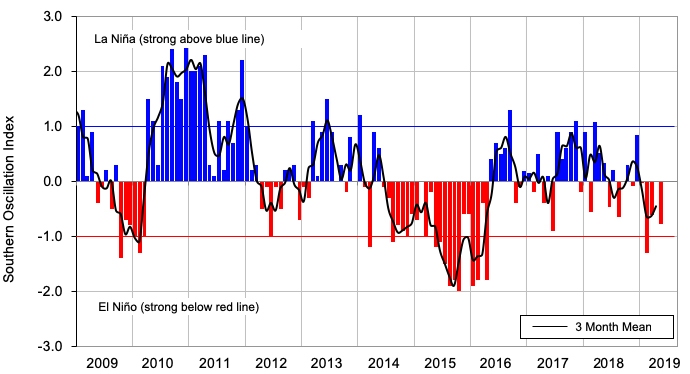 Monthly values of the Southern Oscillation Index (SOI), a measure of changes in atmospheric pressures across the Pacific, and the 3-month mean (black line). SOI mean values: May SOI -0.77; May-July average -0.5.