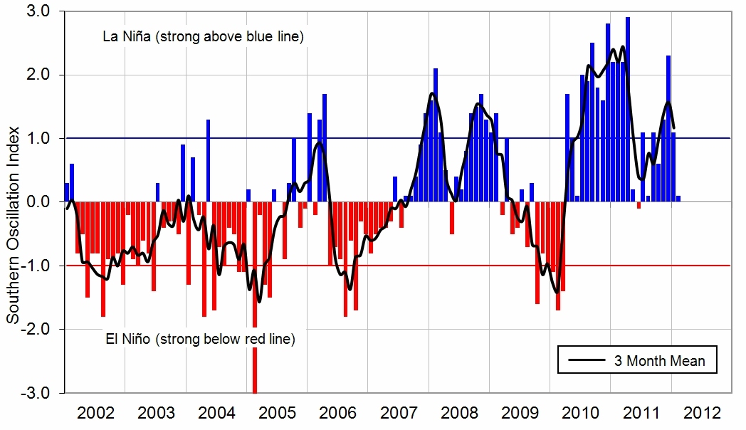 Monthly values of the Southern Oscillation Index (SOI), a measure of changes in atmospheric pressures across the Pacific, and the 3-month mean (black line). SOI mean values: February SOI +0.1; December to February average +1.2.