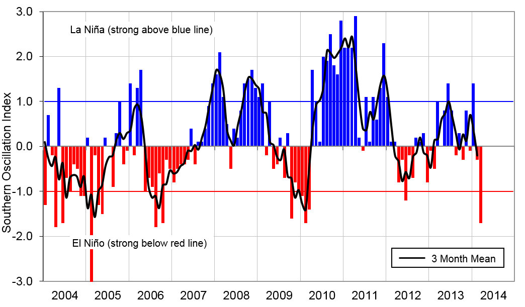 Monthly values of the Southern Oscillation Index (SOI), a measure of changes in atmospheric pressures across the Pacific, and the 3-month mean (black line). SOI mean values: March SOI -1.7; January to March average -0.2.