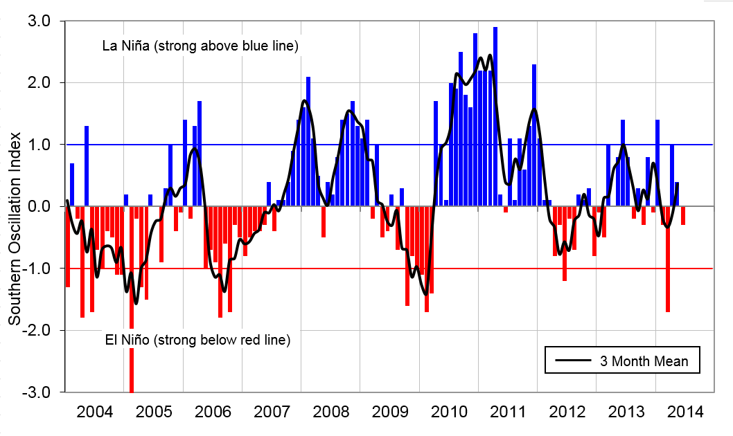 Monthly values of the Southern Oscillation Index (SOI), a measure of changes in atmospheric pressures across the Pacific, and the 3-month mean (black line). SOI mean values: June SOI -0.3; April to June average +0.4.