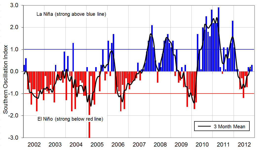 Monthly values of the Southern Oscillation Index (SOI), a measure of changes in atmospheric pressures across the Pacific, and the 3-month mean (black line). SOI mean values: November SOI +0.3; September to November average +0.2.