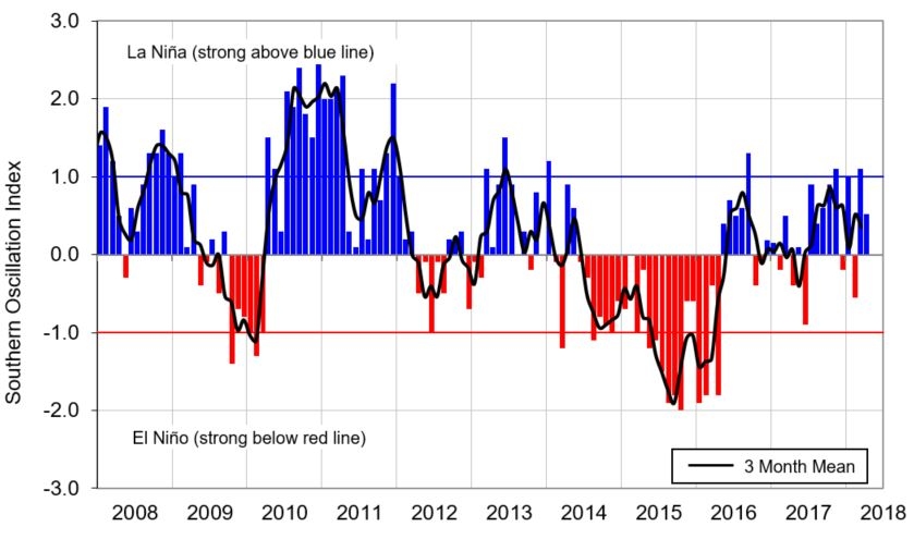 Monthly values of the Southern Oscillation Index (SOI), a measure of changes in atmospheric pressures across the Pacific, and the 3-month mean (black line). SOI mean values: April SOI 0.5; February-April average 0.3.