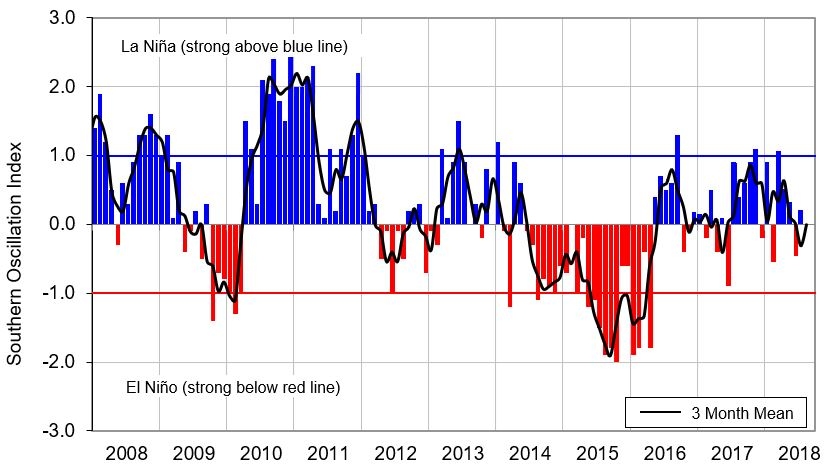 Monthly values of the Southern Oscillation Index (SOI), a measure of changes in atmospheric pressures across the Pacific, and the 3-month mean (black line). SOI mean values: August SOI -0.7; June-August average -0.3.