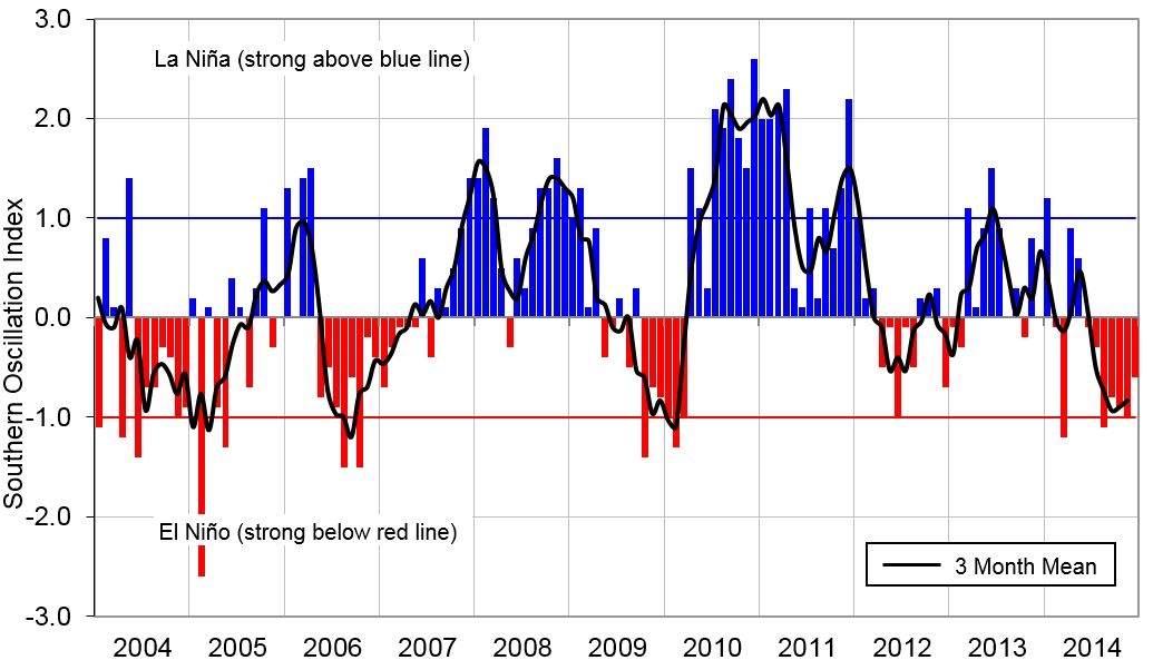 Monthly values of the Southern Oscillation Index (SOI), a measure of changes in atmospheric pressures across the Pacific, and the 3-month mean (black line). SOI mean values: December SOI -0.6; October to December average -0.8.