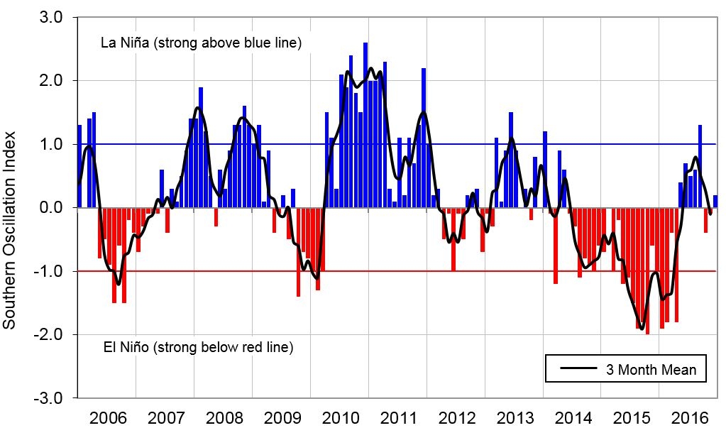 Monthly values of the Southern Oscillation Index (SOI), a measure of changes in atmospheric pressures across the Pacific, and the 3-month mean (black line). SOI mean values: December SOI 0.2; October to December average -0.1.