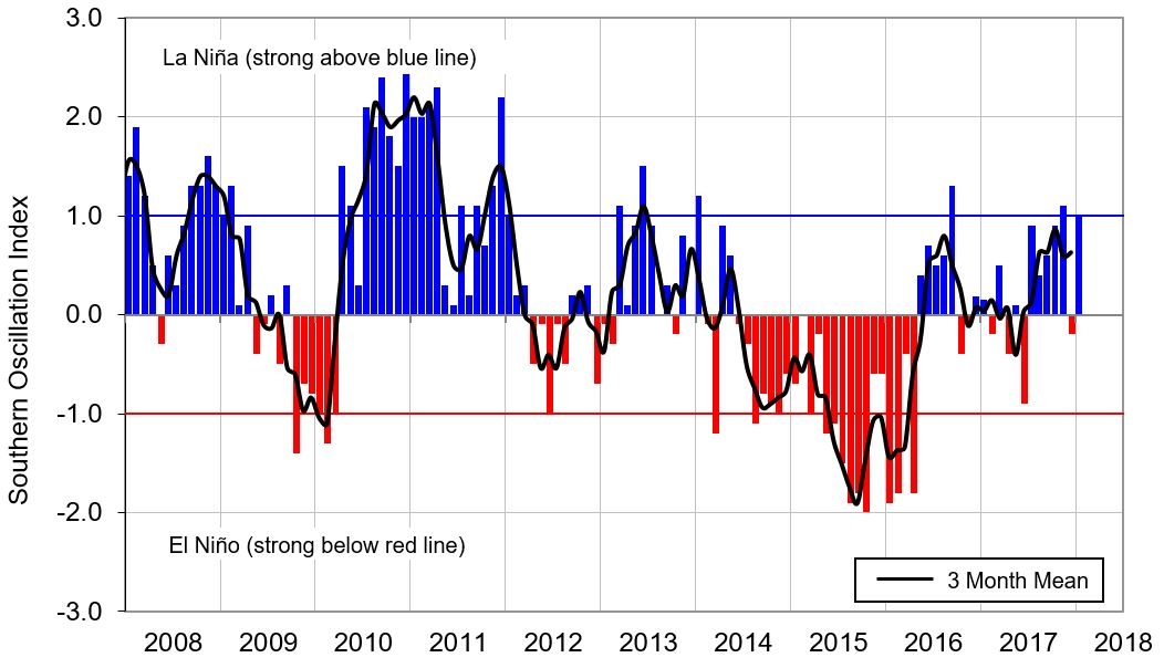 Monthly values of the Southern Oscillation Index (SOI), a measure of changes in atmospheric pressures across the Pacific, and the 3-month mean (black line). SOI mean values: January SOI 1.0; November-January average 0.6.