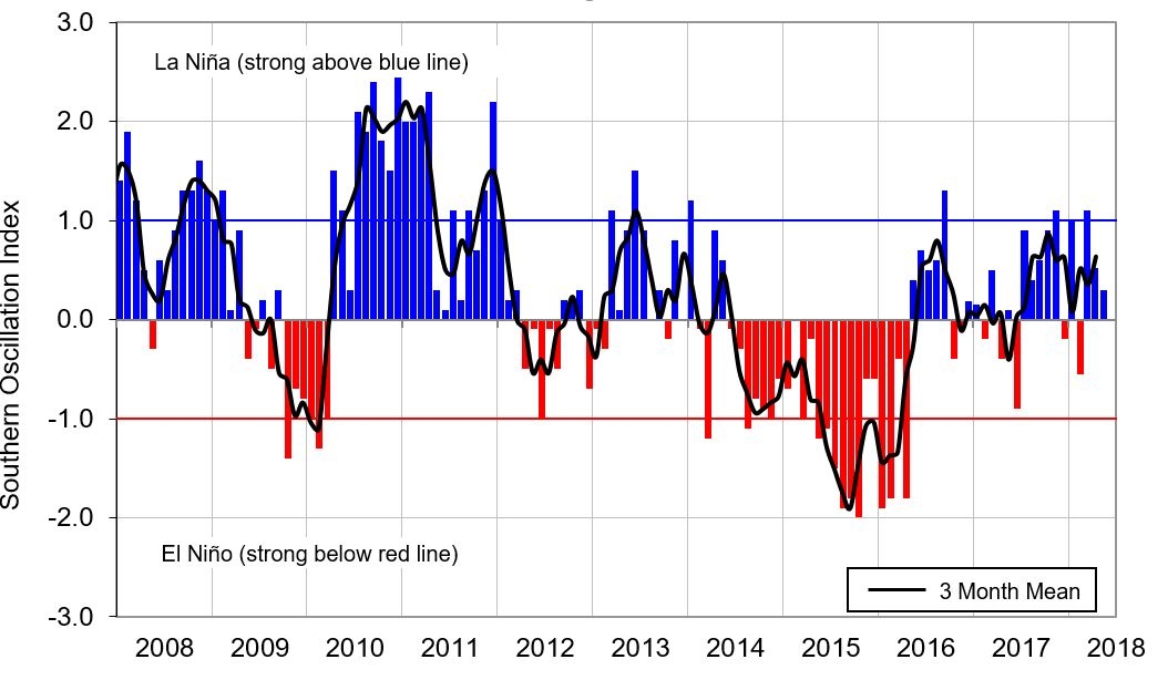 Monthly values of the Southern Oscillation Index (SOI), a measure of changes in atmospheric pressures across the Pacific, and the 3-month mean (black line). SOI mean values: May SOI 0.3; March-May average 0.6.