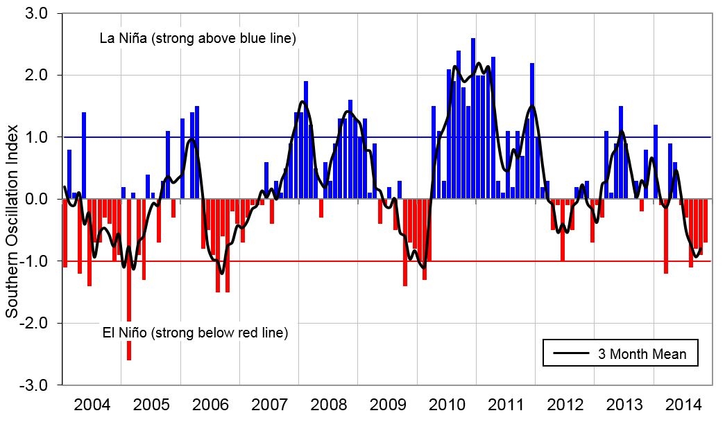Monthly values of the Southern Oscillation Index (SOI), a measure of changes in atmospheric pressures across the Pacific, and the 3-month mean (black line). SOI mean values: November SOI -0.7; September to November average -0.8