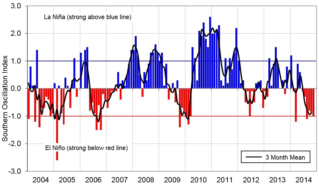Monthly values of the Southern Oscillation Index (SOI), a measure of changes in atmospheric pressures across the Pacific, and the 3-month mean (black line). SOI mean values: November SOI -1; September to November average -0.9.