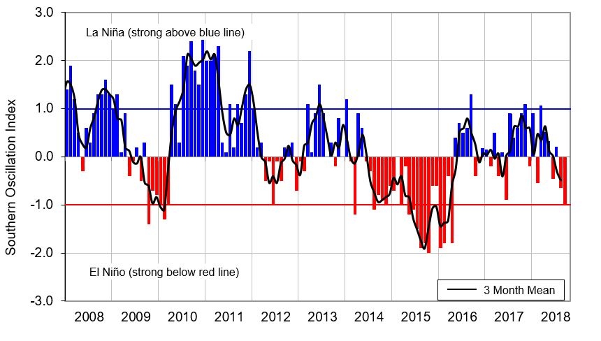 Monthly values of the Southern Oscillation Index (SOI), a measure of changes in atmospheric pressures across the Pacific, and the 3-month mean (black line). SOI mean values: September SOI -1.0; July-September average -0.5.