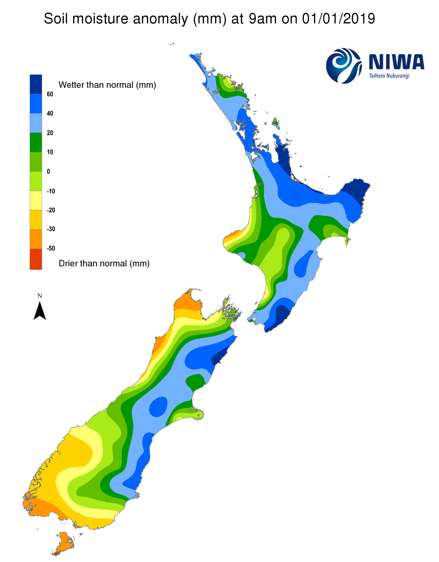 Soil moisture anomaly (mm) at 9am on 01/01/2019