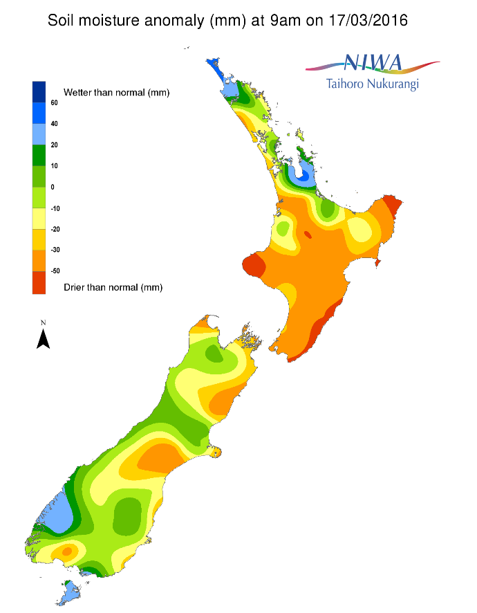 New Zealand soil moisture anomaly (mm) at 9am on 17 March 2016.