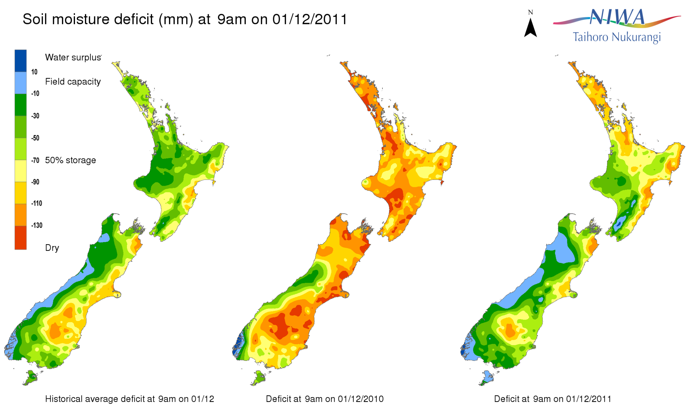 End of month water balance in the pasture root zone for an average soil type, where the available water capacity is 150mm.
