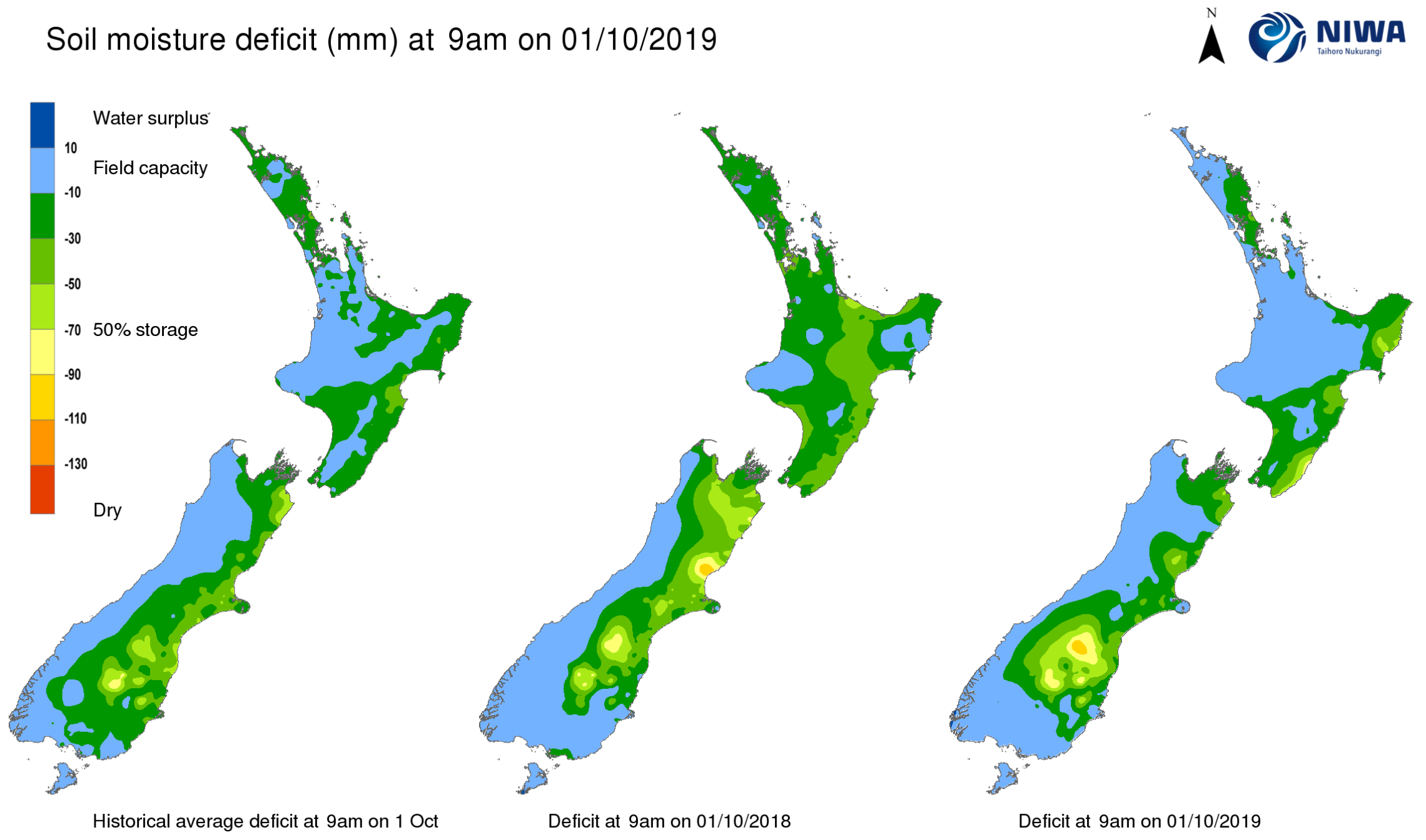End of month water balance in the pasture root zone for an average soil type where the available water capacity is taken to be 150 mm.