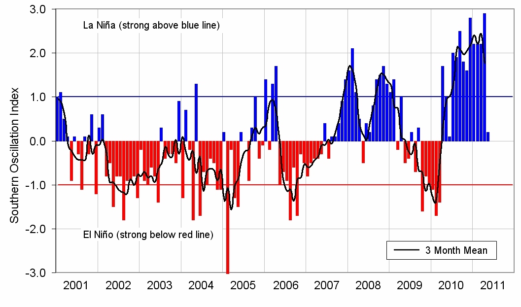 Monthly values of the Southern Oscillation Index (SOI), a measure of changes in atmospheric pressures across the Pacific, and the 3-month mean (black line). SOI mean values: May SOI +0.2; March to May average +1.8