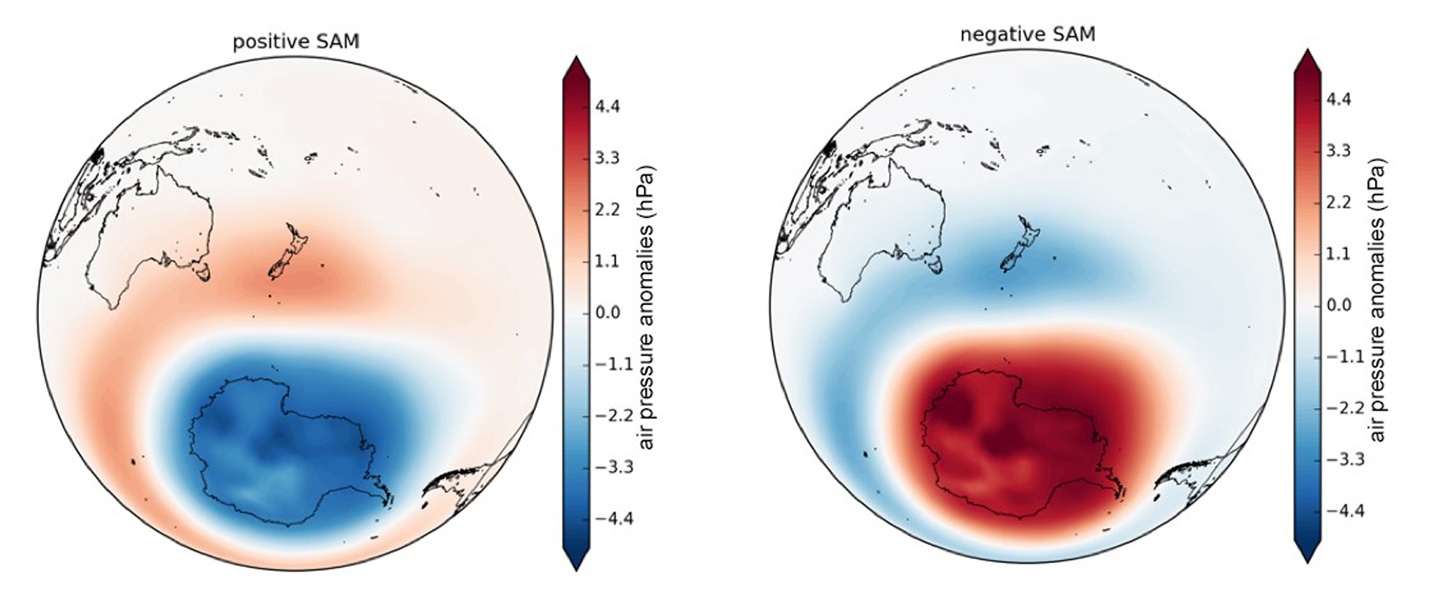 Positive SAM: A schematic of the positive phase of the SAM. Areas of above normal pressure are shaded in red while areas of below normal pressure are shaded in blue.