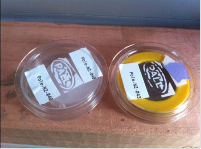 Example filters retrieved from a sampler in Christchurch in May 2014; left: daytime, right: night time (dark colour is mostly soot from domestic woodsmoke).