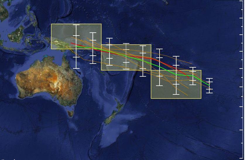 The ensemble of global climate models for rainfall that are used in METPI show an area of higher than normal rainfall associated with the SPCZ position. The green line indicates the average SPCZ position for the forecast period based on the average of 8 climate models. The white vertical bars and ‘whiskers’ indicate the one and two standard deviations between the model projections of the SPCZ position every 5 degrees of longitude.